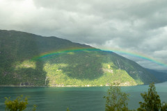 Die Aussicht von der Plattform, die weit in den Fjord hineinragt, war auch an diesem Tag beeindruckend, obwohl es nach wie vor sehr bewölkt war. Dafür verzauberte ein gigantischer Regenbogen über dem Fjord die Sicht noch zusätzlich.